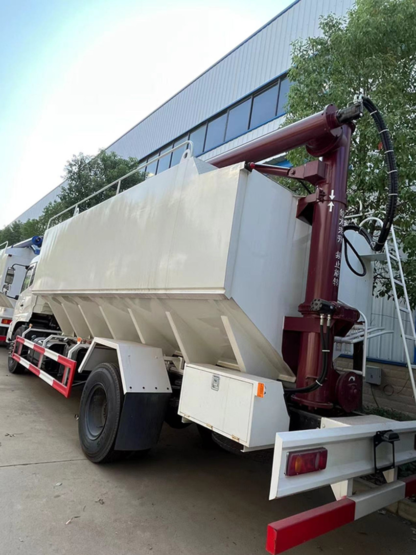 散裝飼料運輸車,散裝飼料車的飼料罐架設在卡車的底盤上,罐頂開有進料口.頂部的一根螺旋輸送卸料管(俗稱卸料絞龍)則可自由回轉和抬升,抬升的仰角可達60度。運輸時,頂部的螺旋管平臥在罐頂;卸料時則抬起,使管端的出料口與畜禽飼養場貯料罐頂部的進料門相接,駕駛室內裝有操縱裝置(操縱裝置也可裝置在罐體尾部),卸料時通過車底的動力輸出軸和減速器來驅動螺旋,以完成卸料。