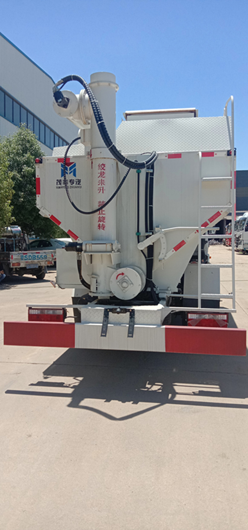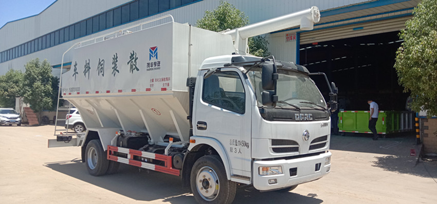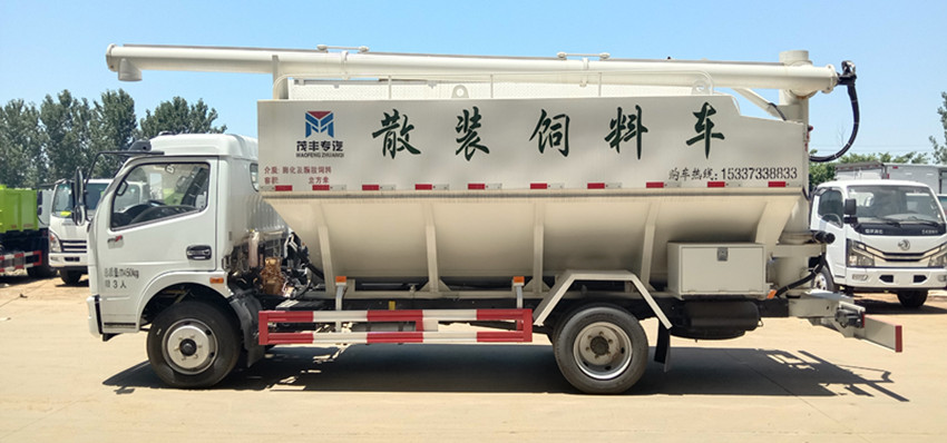 散裝飼料運輸車,散裝飼料車的飼料罐架設在卡車的底盤上,罐頂開有進料口.頂部的一根螺旋輸送卸料管(俗稱卸料絞龍)則可自由回轉和抬升,抬升的仰角可達60度。運輸時,頂部的螺旋管平臥在罐頂;卸料時則抬起,使管端的出料口與畜禽飼養場貯料罐頂部的進料門相接,駕駛室內裝有操縱裝置(操縱裝置也可裝置在罐體尾部),卸料時通過車底的動力輸出軸和減速器來驅動螺旋,以完成卸料。