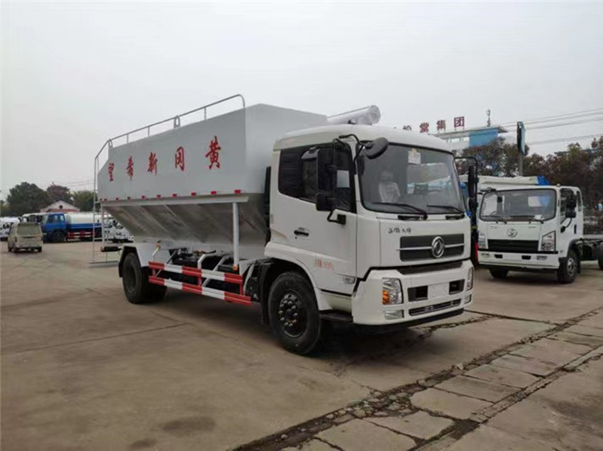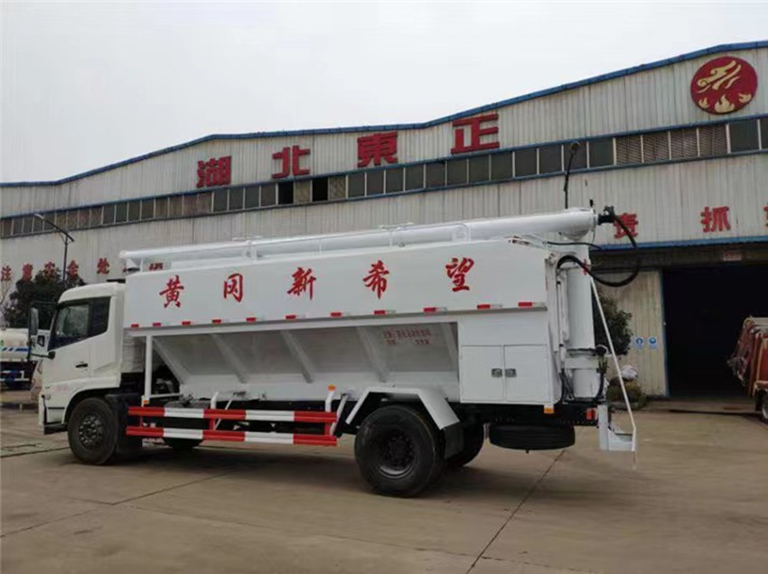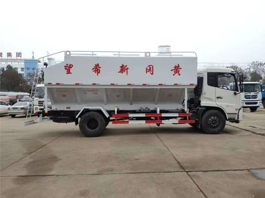 散裝飼料運輸車,散裝飼料車的飼料罐架設(shè)在卡車的底盤上,罐頂開有進料口.頂部的一根螺旋輸送卸料管(俗稱卸料絞龍)則可自由回轉(zhuǎn)和抬升,抬升的仰角可達60度。運輸時,頂部的螺旋管平臥在罐頂;卸料時則抬起,使管端的出料口與畜禽飼養(yǎng)場貯料罐頂部的進料門相接,駕駛室內(nèi)裝有操縱裝置(操縱裝置也可裝置在罐體尾部),卸料時通過車底的動力輸出軸和減速器來驅(qū)動螺旋,以完成卸料。