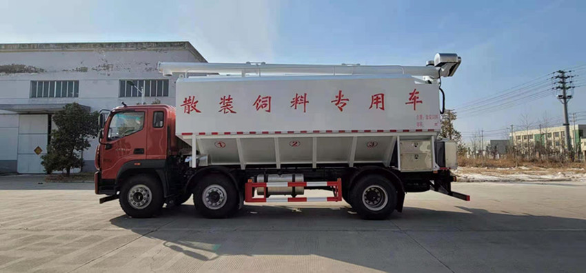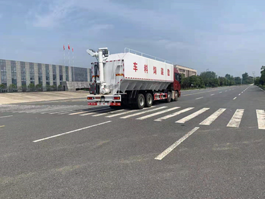 散裝飼料運輸車,散裝飼料車的飼料罐架設在卡車的底盤上,罐頂開有進料口.頂部的一根螺旋輸送卸料管(俗稱卸料絞龍)則可自由回轉和抬升,抬升的仰角可達60度。運輸時,頂部的螺旋管平臥在罐頂;卸料時則抬起,使管端的出料口與畜禽飼養場貯料罐頂部的進料門相接,駕駛室內裝有操縱裝置(操縱裝置也可裝置在罐體尾部),卸料時通過車底的動力輸出軸和減速器來驅動螺旋,以完成卸料。