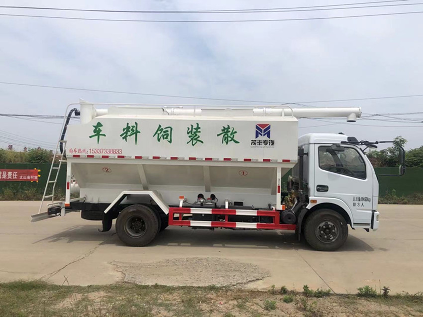 散裝飼料運輸車,散裝飼料車的飼料罐架設在卡車的底盤上,罐頂開有進料口.頂部的一根螺旋輸送卸料管(俗稱卸料絞龍)則可自由回轉和抬升,抬升的仰角可達60度。運輸時,頂部的螺旋管平臥在罐頂;卸料時則抬起,使管端的出料口與畜禽飼養場貯料罐頂部的進料門相接,駕駛室內裝有操縱裝置(操縱裝置也可裝置在罐體尾部),卸料時通過車底的動力輸出軸和減速器來驅動螺旋,以完成卸料。