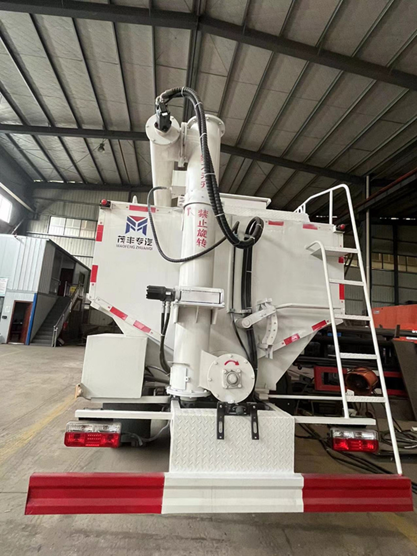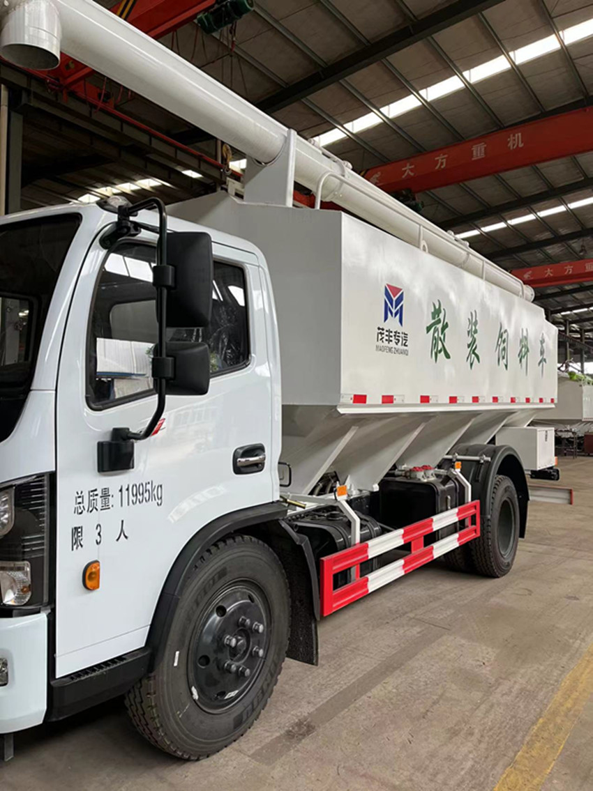 散裝飼料運輸車,散裝飼料車的飼料罐架設在卡車的底盤上,罐頂開有進料口.頂部的一根螺旋輸送卸料管(俗稱卸料絞龍)則可自由回轉和抬升,抬升的仰角可達60度。運輸時,頂部的螺旋管平臥在罐頂;卸料時則抬起,使管端的出料口與畜禽飼養場貯料罐頂部的進料門相接,駕駛室內裝有操縱裝置(操縱裝置也可裝置在罐體尾部),卸料時通過車底的動力輸出軸和減速器來驅動螺旋,以完成卸料。